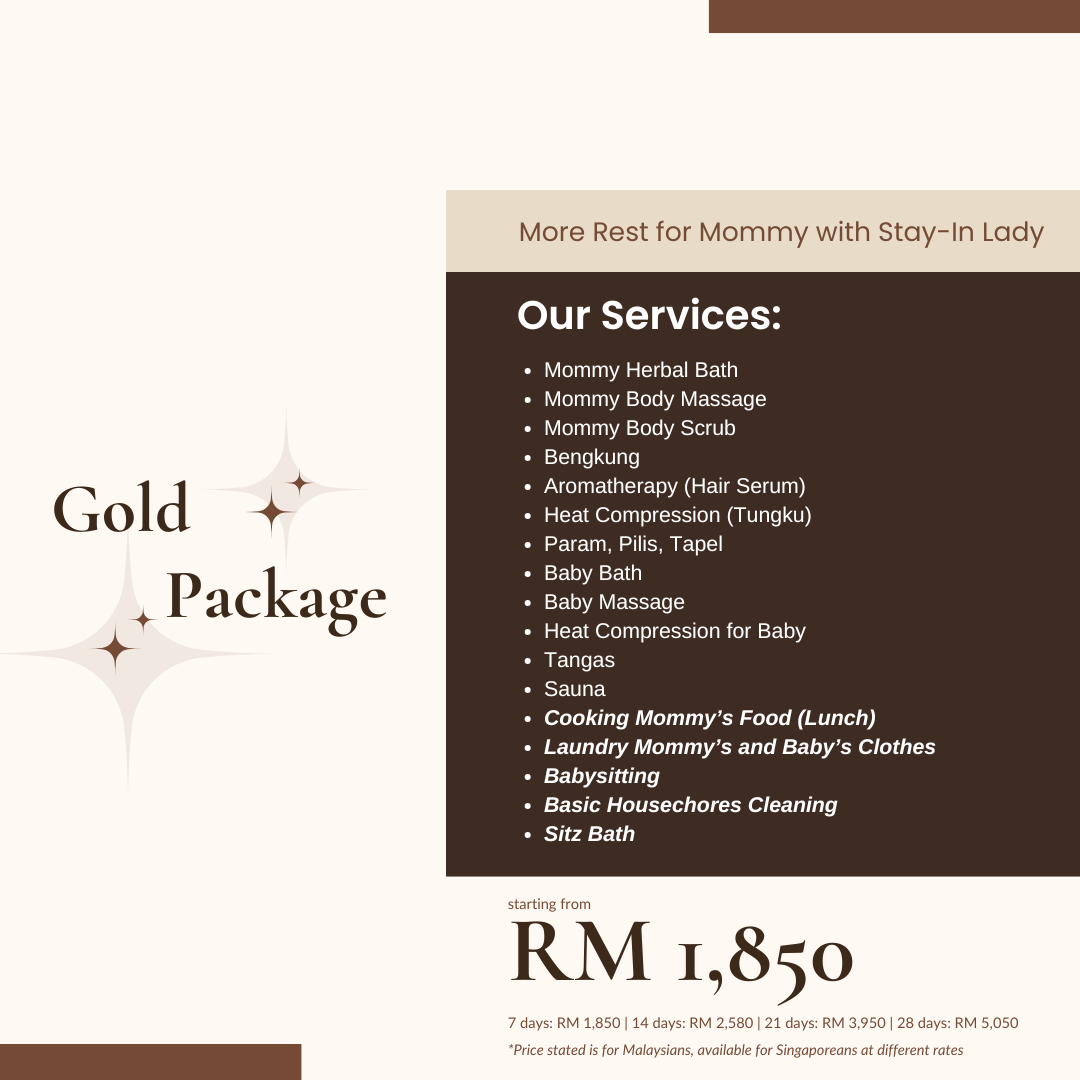 Designed to give new mothers complete peace of mind, this package covers everything from mommy recovery treatments and newborn care to cooking, laundry, babysitting, and basic house chores.